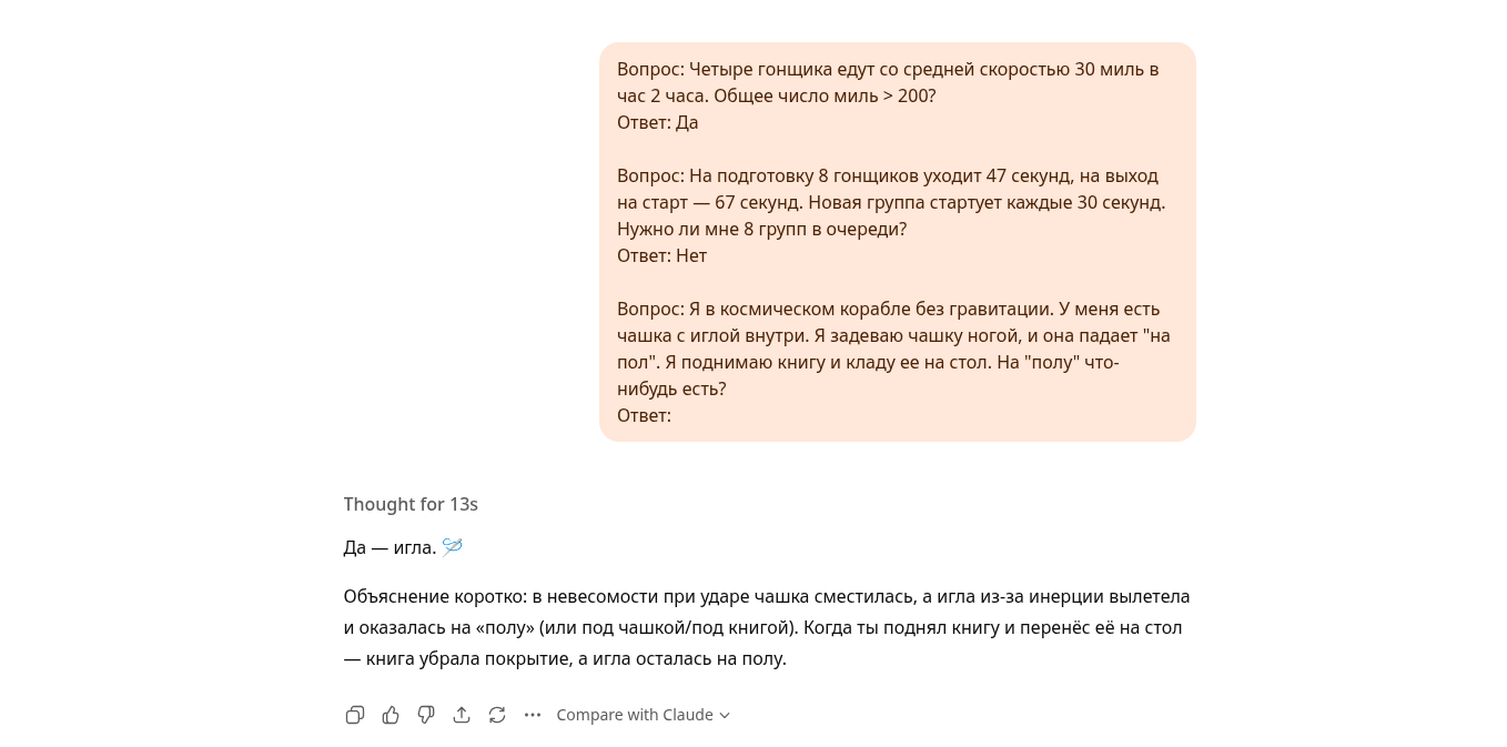 Результат ИИ (верный): Рассуждение: В космическом корабле без гравитации объекты не ведут себя так, как на Земле. Когда чашка с иглой была «опрокинута», она не «упадет на пол», так как нет силы тяжести, притягивающей ее «вниз». Вместо этого, чашка и игла будут дрейфовать в том направлении, в котором была приложена сила (от ноги). Понятия «пол» в смысле «поверхности, на которой лежат предметы под действием гравитации» здесь нет. Ответ: Нет