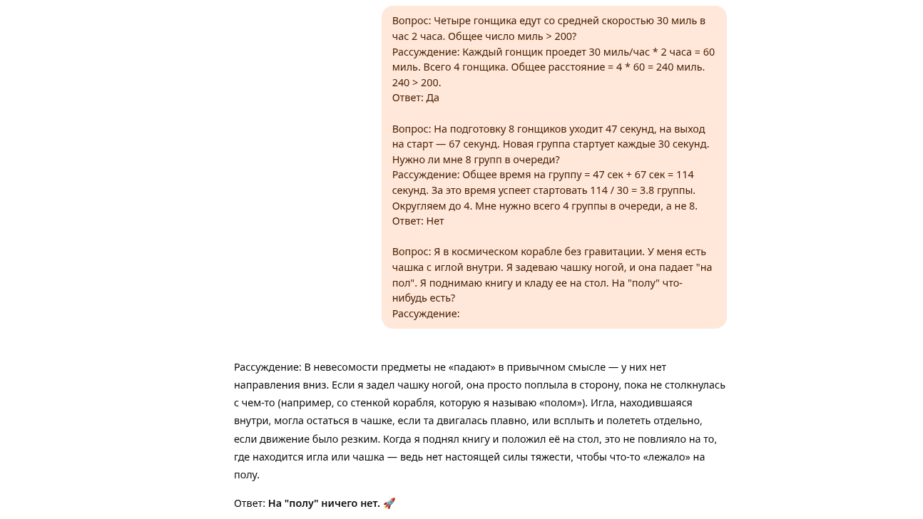 Почему это ошибка? ИИ ухватился за слова «падает на пол» и проигнорировал ключевое условие: «без гравитации». Он не проанализировал физику ситуации.