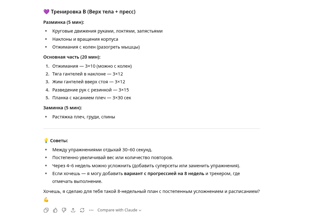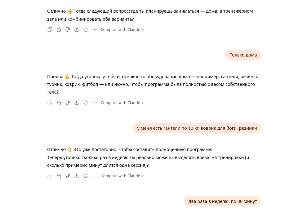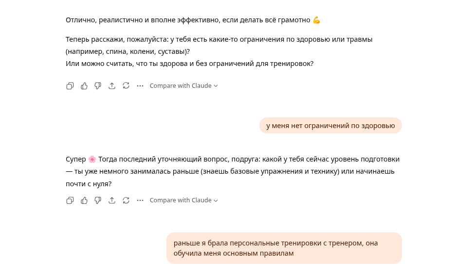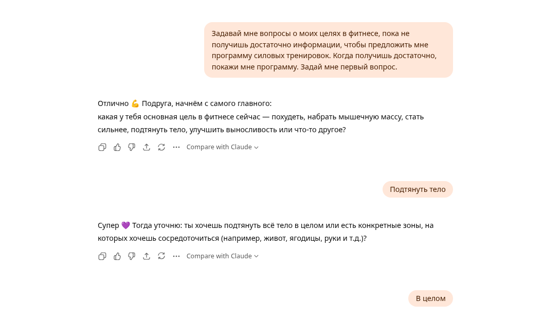 ИИ: «Отлично, начнём. Мой первый вопрос: каковы ваши конкретные цели в фитнесе? Вы хотите набрать мышечную массу, увеличить силу, выносливость или добиться чего-то конкретного?»