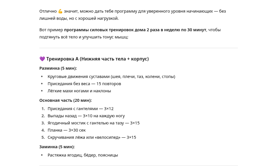 После того как ИИ соберёт достаточно информации, он автоматически переходит к выполнению основной задачи — показывает вам персонализированную программу тренировок. Обратите внимание, что ИИ не просто выдаст общий план, а учтёт все ваши ответы (например, подберёт упражнения, которые часто рекомендуют при тендинопатии надколенника).