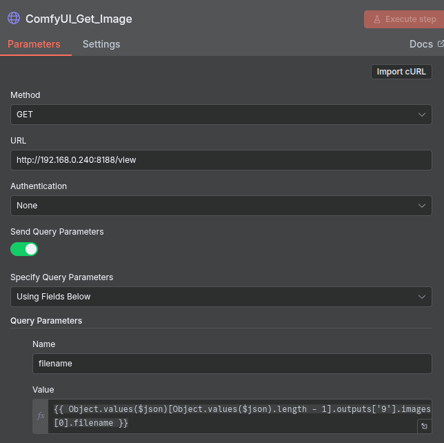Из данных истории, полученных на предыдущем шаге, извлекаем точное имя сгенерированного файла (например, ComfyUI_00001_.png). Это критический шаг, так как имя файла уникально и нужно для его скачивания.