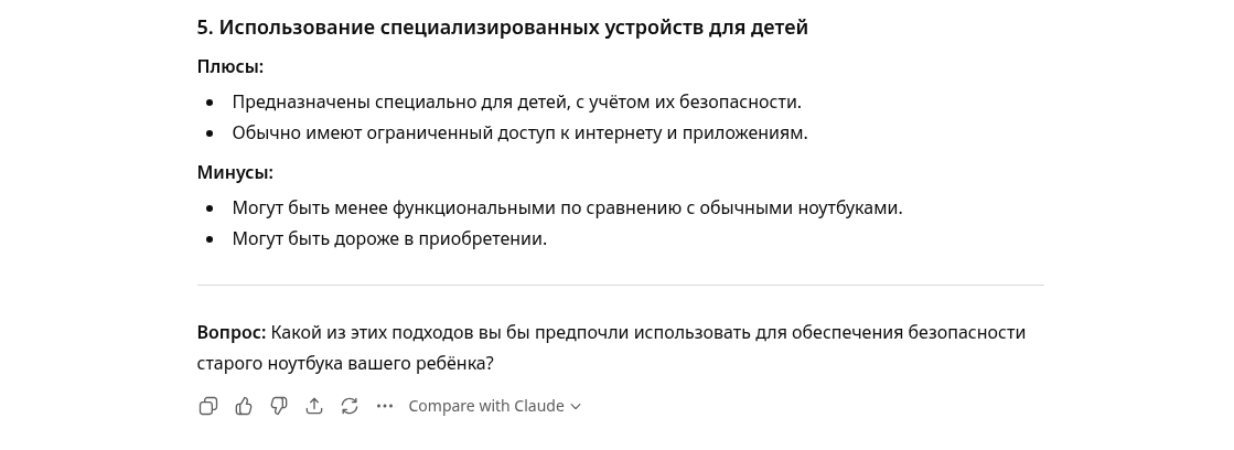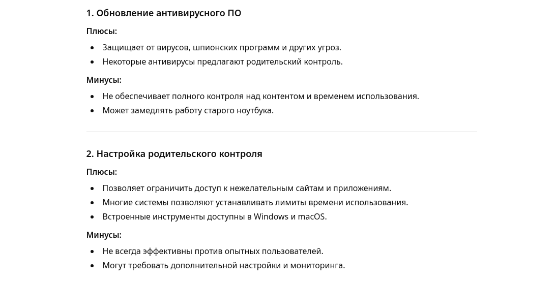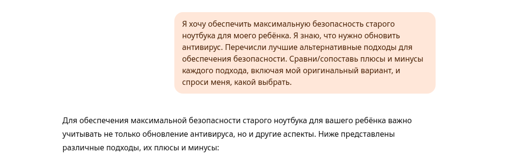 «Я хочу обеспечить максимальную безопасность старого ноутбука для моего ребёнка. Я знаю, что нужно обновить антивирус. Перечисли лучшие альтернативные подходы для обеспечения безопасности. Сравни/сопоставь плюсы и минусы каждого подхода, включая мой оригинальный вариант, и спроси меня, какой выбрать.»