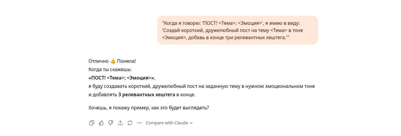 Правило: «Когда я говорю: ‘ПОСТ! <Тема>; <Эмоция>’, я имею в виду: ‘Создай короткий, дружелюбный пост на тему <Тема> в тоне <Эмоция>, добавь в конце три релевантных хештега.'»